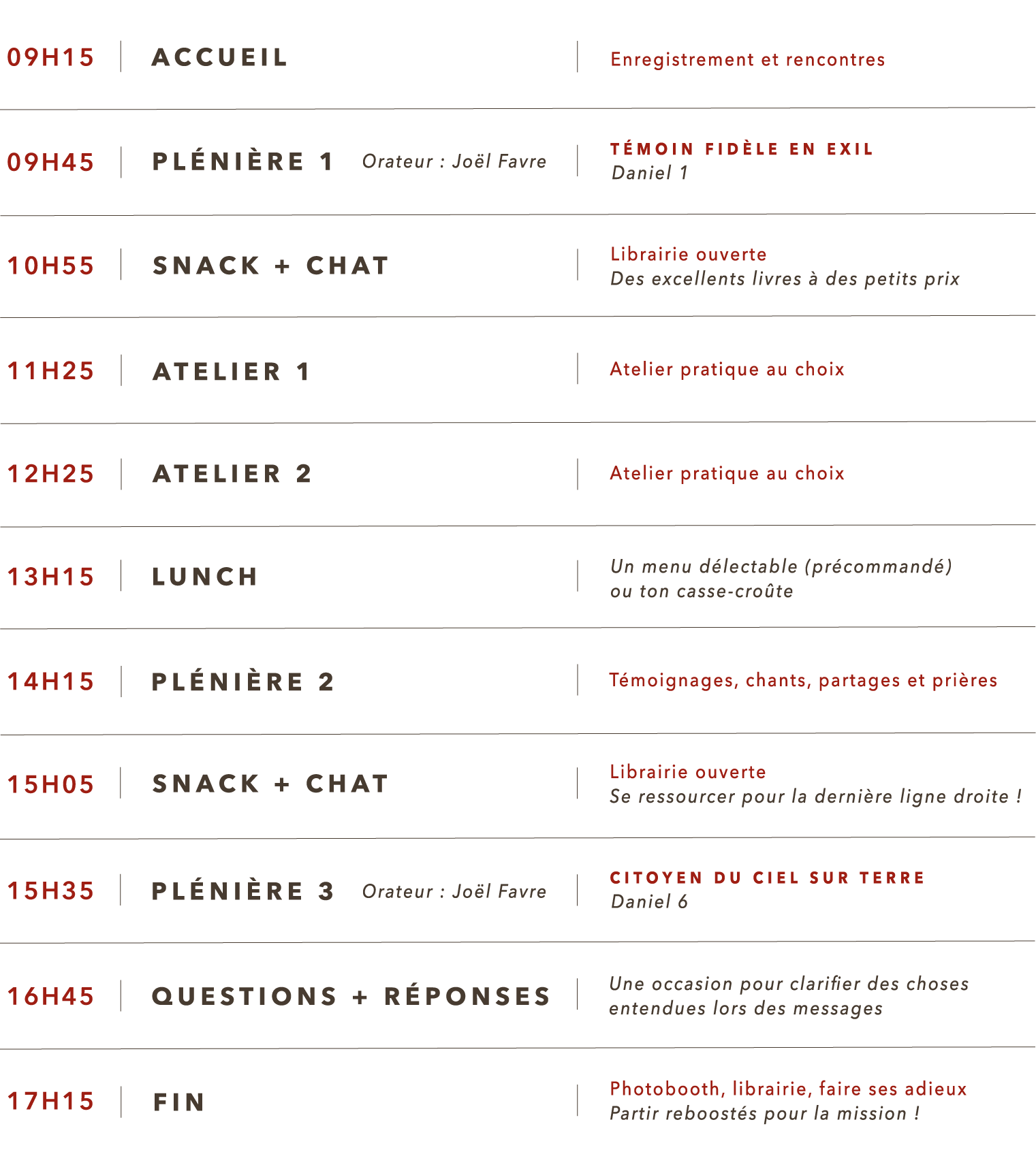 L’exemple de Daniel et ses amis nous montre que ce n’est pas mission impossible ! Grâce aux expériences vécues par l’orateur, cet atelier donnera des encouragements bibliques et des conseils pratiques à des chrétiens qui se retrouveront éventuellement en positions d’influence. Ainsi, tu verras que ces positions pourraient présenter de nombreuses occasions pour être des témoins fidèles de Jésus, et impacter la vie de beaucoup !